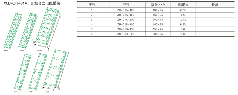 組合電纜橋架只要采用100、150、200mm的三種基型就可以組裝成您所需要尺寸的電纜