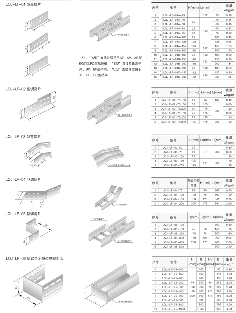 鋁合金電纜橋架在某種結(jié)構(gòu)形式中無其它結(jié)構(gòu)形式中的某-種產(chǎn)品類別,選型可作代用表示。例如:LQU-CC型槽式鋁合金電纜橋架結(jié)構(gòu)形式中,無鋁合金配線橋架中的LPC-03D, 即表示為LFC-CC-03D。